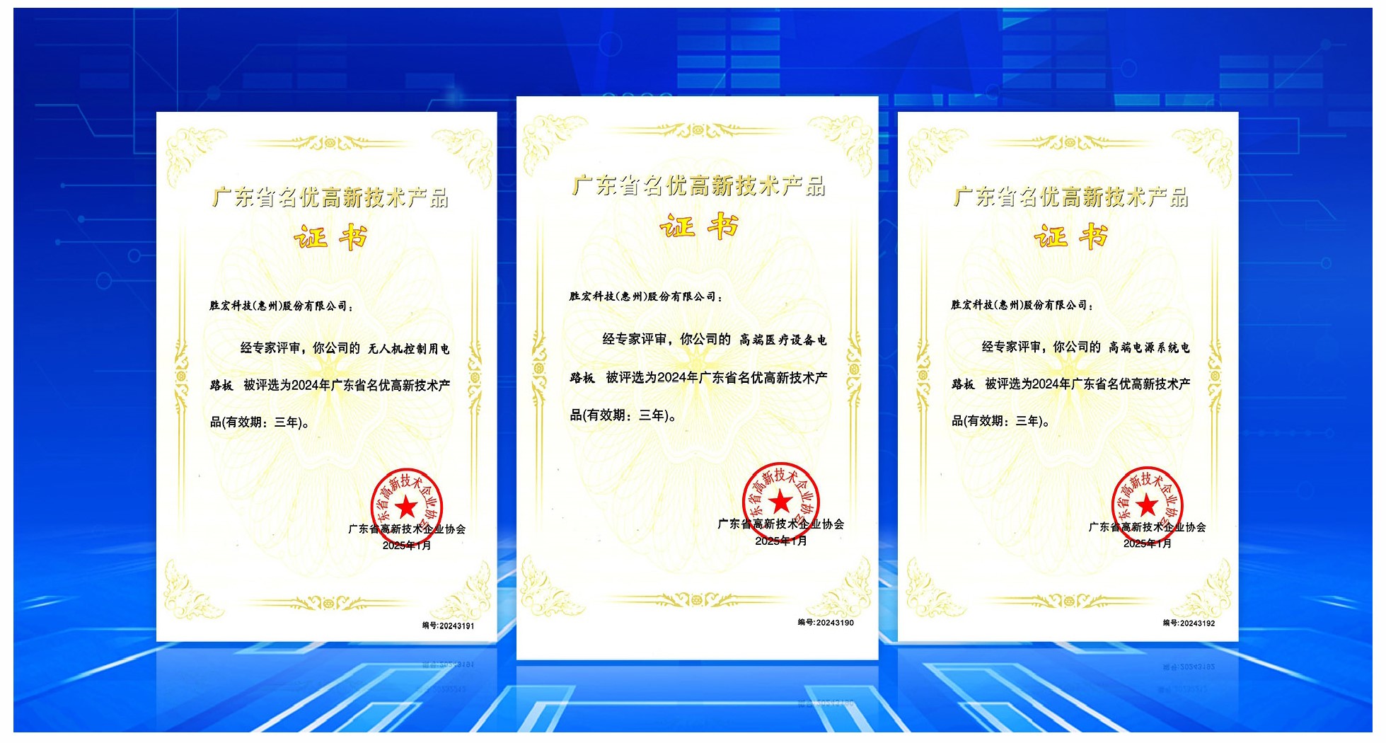 近日,广东省高新技术企业协会正式公布2024年广东省名优高新技术产品名单。在众多优秀产品中,我司自主研发的“高端电源系统电路板”“高端医疗设备电路板”“无人机控制用电路板”三款产品成功入选,充分彰显了我司在技术创新领域的卓越实力。